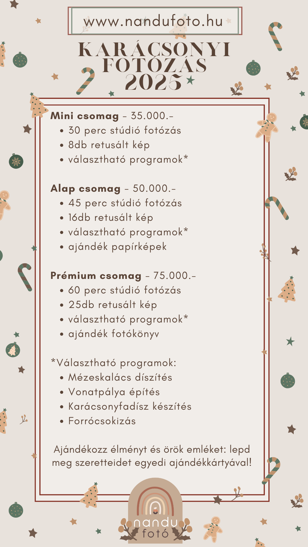 Idén az alábbi programokat tudjátok majd választani a Karácsonyi fotózásokhoz: